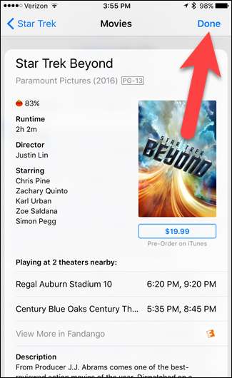 Wir haben auf den Star Trek Beyond-Film getippt, um herauszufinden, wo er lokal abgespielt wird. Um weitere Kinos zu finden, in denen dieser Film läuft, können Sie auf „Mehr in Fandango anzeigen“ tippen. Tippen Sie erneut auf „Fertig“, um das Overlay zu schließen und zur App zurückzukehren.