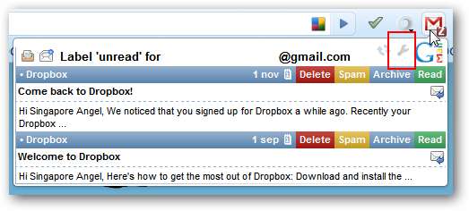 Bevor Sie die Erweiterung verwenden, sollten Sie einen kurzen Blick auf die Optionen werfen, um festzustellen, ob Sie die Einstellungen anpassen möchten (oder müssen), damit Google Mail Checker Plus für Ihre persönlichen Anforderungen optimal funktioniert. Es gibt zwei Methoden, um auf die Optionen zuzugreifen: Die erste erfolgt über das „Vorschaufenster“ (kleines Schraubenschlüsselsymbol in der oberen rechten Ecke).