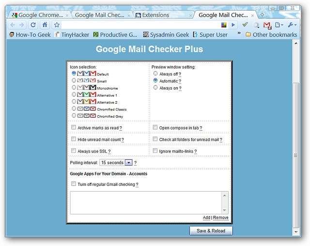 Dies sind die verfügbaren Optionen. Sie können einen Symbolsatz auswählen, der am besten zu Ihrem aktuellen Thema passt, die Einstellung "Vorschaufenster" ändern, verschiedene Einstellungen aktivieren (z. B. Anzahl ungelesener E-Mails ausblenden, Registerkarte "Verfassen in Registerkarte öffnen" und Alle Ordner auf ungelesene E-Mails prüfen) ), wählen Sie das "Abfrageintervall" und / oder fügen Sie Domains für Ihre Google Apps-Konten hinzu.