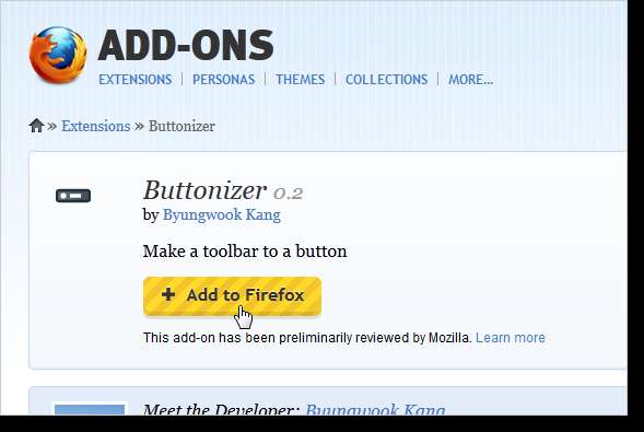 Buttonizer ist ein Firefox-Add-On, mit dem Sie schnell jeweils eine Symbolleiste in eine Schaltfläche in der Adressleiste konvertieren können. Um Buttonizer zu installieren, rufen Sie die Buttonizer-Seite auf der Mozilla Add-ons-Website über den Link am Ende dieses Artikels auf. Klicken Sie auf die Schaltfläche Zu Firefox hinzufügen.