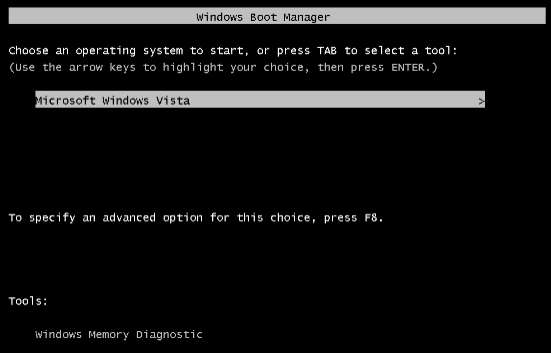 Es ist jedoch etwas seltsam, dorthin zu gelangen, wenn Sie nur Vista auf dem Computer installiert haben. Sie müssen F8 für das Startmenü gedrückt halten und dann Esc drücken, um zum obigen Bildschirm zu gelangen.