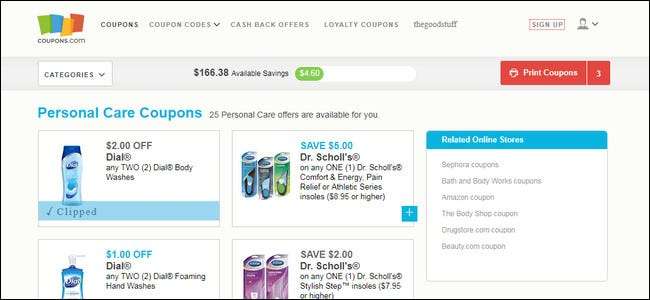 Coupons.com behauptet, der größte Anbieter von digitalen Coupons in den Vereinigten Staaten zu sein. Ihre Website listet Hunderttausende von Gutscheinen, Hunderten von Geschäften und Cashback-Angeboten auf ihrer Website auf. Ihre Website-Erfahrung ähnelt der von echtem Coupon-Clipping. Anstatt jeweils einen Gutschein auszuwählen, können Sie alle Gutscheine auswählen, die Sie verwenden möchten, und diese werden Ihrem Gutschein hinzugefügt Gutscheinwagen .