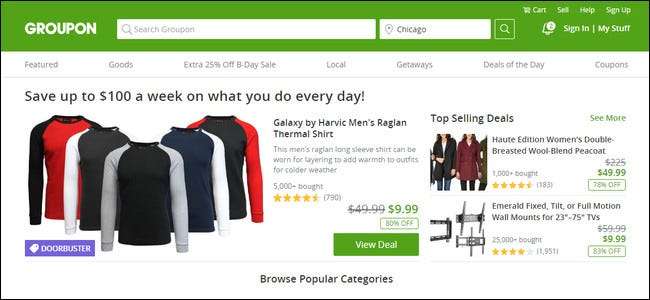 Groupon ist eine der beliebtesten Deal-Sites da draußen. Wenn Sie auf Deal-Jagd sind, sind Sie auf Groupon gestoßen. Es deckt eine Vielzahl von Unternehmen ab, darunter Technologie, Kleidung, Lebensmittel, Dienstleistungen und mehr.