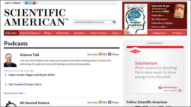 Wissenschaftlicher Amerikaner bietet kostenlose Podcasts zu verschiedenen wissenschaftlichen Themen an, beispielsweise zur Wochenzeitung Wissenschaftsgespräch und 60-Sekunden-Tech und die tägliche 60-Sekunden-Wissenschaft und 60-Sekunden-Raum . Abonnieren Sie die Podcasts als RSS-Feeds oder über iTunes.