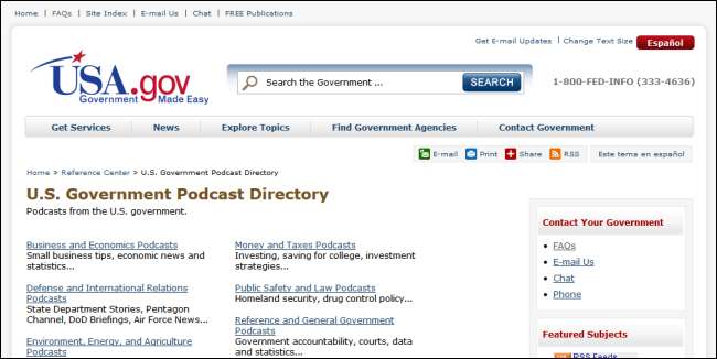 Das Podcast-Verzeichnis der US-Regierung bietet Zugang zu Podcasts aus vielen verschiedenen Bereichen der Regierung, wie Wissenschaft und Technologie, Geschichte, Kunst und Kultur, Wirtschaft und öffentliche Sicherheit und Recht.