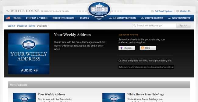 Podcasts des Weißen Hauses bieten Zugang zu Pressekonferenzen des Weißen Hauses, der wöchentlichen Ansprache, Reden und Veranstaltungen, Musik und Kunst sowie Open for Questions, einer Reihe von Live-Chats mit Vertretern des Weißen Hauses und der Öffentlichkeit, die ein breites Themenspektrum abdecken.