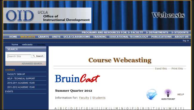 UCLA Course Webcasting (oder BruinCast) wird vom Office of Instructional Development zur Verfügung gestellt. Einige Kursvorträge werden der Öffentlichkeit online als Audio-Podcasts zur Verfügung gestellt, andere haben jedoch eingeschränkten Zugang.