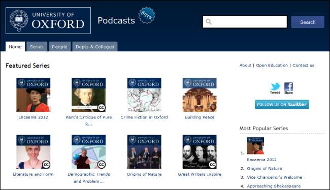 Das Podcasts der Universität Oxford Die Website bietet Podcasts zu Themen wie öffentlichen Vorträgen, Lehrmaterial, Interviews mit führenden Wissenschaftlern und sogar Informationen zur Bewerbung an der Universität. Das Material kann im Audio-, Video- oder Dokumentformat vorliegen und ist in einer Reihe verwandter Vorträge oder Vorträge angeordnet. EIN vollständige Liste aller Serien ist verfügbar.