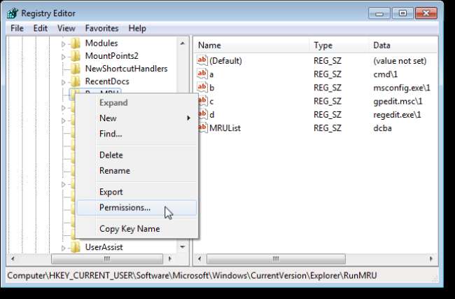 Klicken Sie mit der rechten Maustaste auf den RunMRU-Schlüssel und wählen Sie im Popup-Menü die Option Berechtigungen.