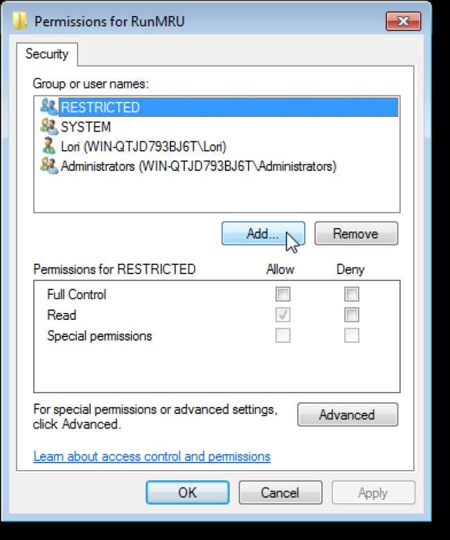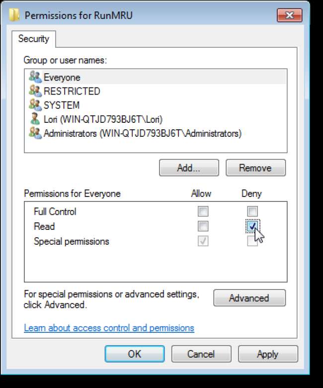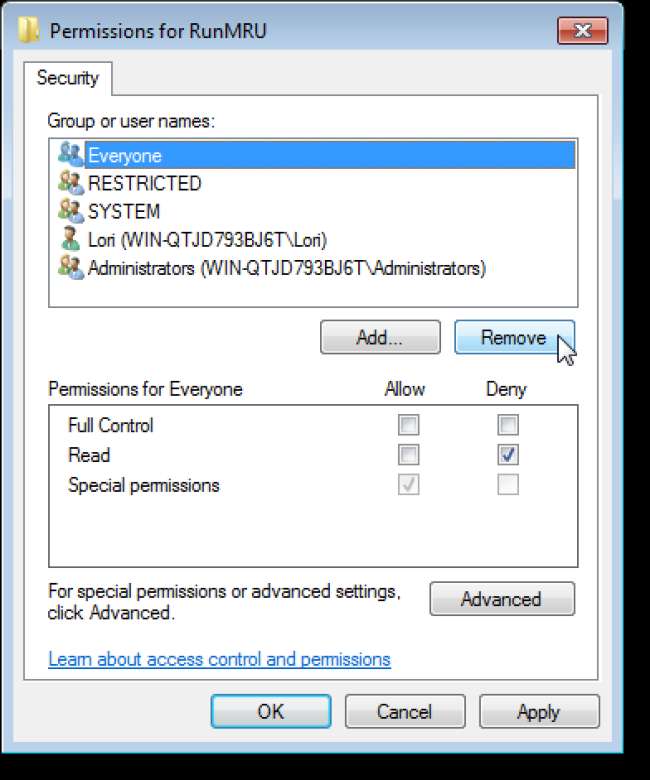 Wenn Sie die Verlaufsliste im Dialogfeld Ausführen wiederherstellen möchten, öffnen Sie den Registrierungseditor erneut und navigieren Sie zu demselben zuvor erwähnten Schlüssel. Klicken Sie mit der rechten Maustaste auf den RunMRU-Schlüssel, wählen Sie Berechtigungen aus und entfernen Sie "Jeder" aus der Liste "Gruppen- oder Benutzernamen" im Dialogfeld "Berechtigungen". Schließen Sie das Dialogfeld.