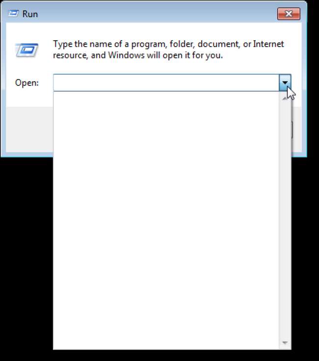 Schließen Sie den Registrierungseditor und öffnen Sie das Dialogfeld Ausführen. Beachten Sie, dass die Dropdown-Liste Öffnen, die normalerweise den Verlauf der eingegebenen Befehle enthält, jetzt leer ist. Wenn Sie Befehle eingeben, werden diese nicht in der Verlaufsliste gespeichert. Die Liste bleibt leer.