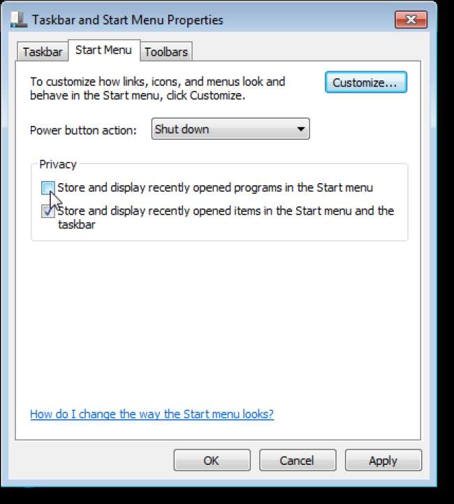 Aktivieren Sie im Dialogfeld Eigenschaften der Taskleiste und des Startmenüs das Kontrollkästchen Zuletzt geöffnete Programme im Startmenü speichern und anzeigen, damit das Kontrollkästchen KEIN Häkchen enthält. OK klicken.
