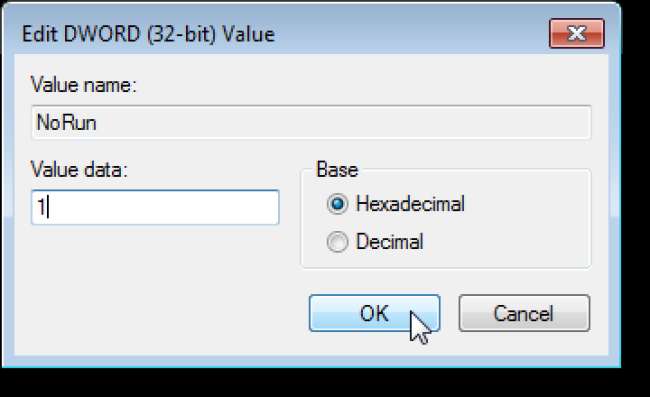 Geben Sie "NoRun" als Namen für den neuen Wert ein und drücken Sie die Eingabetaste, um ihn zu akzeptieren. Doppelklicken Sie auf den neuen Wert.