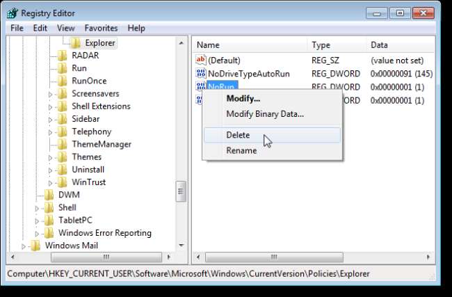 Klicken Sie mit der rechten Maustaste auf den NoRun-Wert und wählen Sie Löschen.