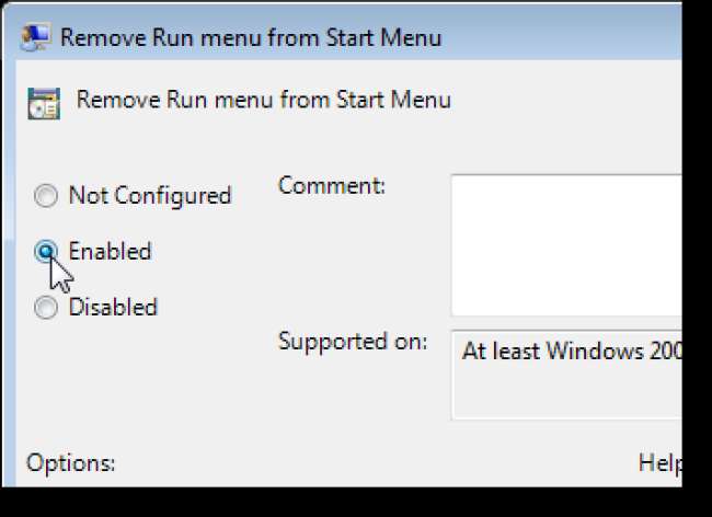 Um die Einstellung erneut zu deaktivieren und das Dialogfeld Ausführen zu aktivieren, kehren Sie zum lokalen Gruppenrichtlinien-Editor zurück und wählen Sie Deaktiviert oder Nicht konfiguriert.