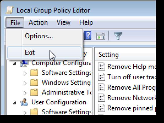 Wählen Sie im Menü Datei die Option Beenden, um den lokalen Gruppenrichtlinien-Editor zu schließen.