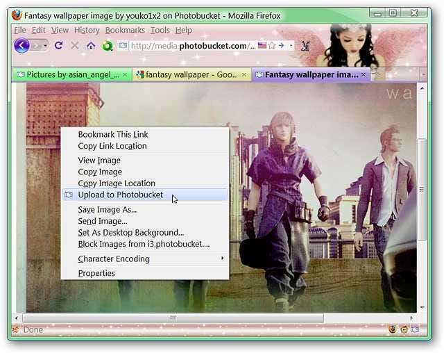 Nachdem Sie das ausgewählte Bild in einem neuen Tab (oder Fenster) geöffnet haben, rufen Sie das „Kontextmenü“ auf und wählen Sie „Auf Photobucket hochladen“.