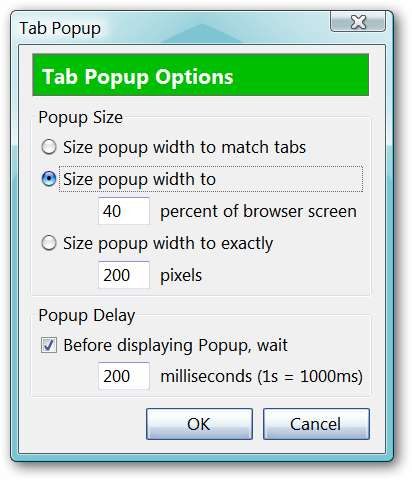 Nach der Installation von Tab Popup sollten Sie einen kurzen Blick auf die Optionen werfen, um die Größe des Vorschaufensters und die Zeitverzögerung zu bestimmen, die Ihren Anforderungen am besten entspricht. Die Standardeinstellung wird hier angezeigt. Beachten Sie, dass Sie die Pixelgröße so genau festlegen können, wie Sie möchten ( Sehr schön! ).