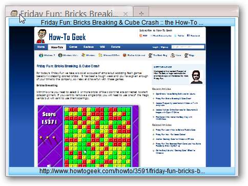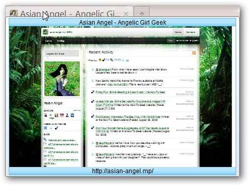 Wie Sie sehen können, bietet das Tab-Popup eine schöne Ansicht der Webseiten. Es enthält auch den Namen der jeweiligen Webseite / Website, die oben angezeigt wird, und die Adresse unten. Der einfarbige Hintergrund / Rand macht den Text schön.