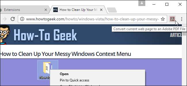 Diese Browsererweiterung bietet auch einige andere Funktionen, von denen Sie keine benötigen. Das Symbolleistensymbol zeigt an, dass die aktuelle Webseite in eine Adobe PDF-Datei konvertiert werden kann. Das klingt praktisch, aber Sie können als PDF drucken in Chrome ohne zusätzliche Software. Klicken Sie einfach auf die Menüschaltfläche, wählen Sie "Drucken", klicken Sie unter "Ziel" auf die Schaltfläche "Ändern" und wählen Sie "Als PDF speichern". Drucken Sie das Dokument von hier aus und Chrome speichert es als PDF-Datei. Windows 10 Jetzt ist auch PDF-Druck integriert.