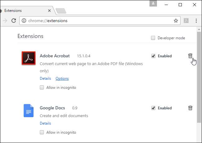 Wenn Sie die Erweiterung installiert haben und sie nicht mehr möchten, deinstallieren Sie sie in Chrome. Klicken Sie auf die Menüschaltfläche von Chrome, wählen Sie "Weitere Tools"> "Erweiterungen" und klicken Sie auf den Papierkorb rechts neben "Adobe Acrobat", um ihn aus Ihrem Browser zu entfernen.