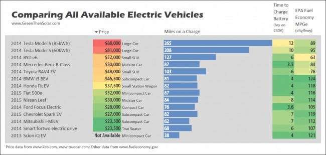 Um einige Zahlen zu klappern (von den Herstellern selbst gezogen), beginnen wir mit den drei beliebtesten Modellen, die heute die Runde machen: der Tesla Model S Limousine, dem Nissan Leaf und dem Chevy Spark. Nach Angaben des Herstellers sind diese Fahrzeuge so ausgelegt, dass sie eine maximale Reichweite von erreichen 208 - 270 Meilen , 84 - 107 Meilen , und 82 Meilen jeweils mit einer einzigen Ladung.