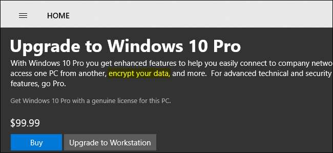 Das BitLocker-Funktion war ein Teil von die Professional Edition von Windows seit es mit Windows Vista eingeführt wurde. Typische PCs, die Sie kaufen, werden mit Windows 10 Home geliefert, und Microsoft berechnet 99,99 US-Dollar für das Upgrade auf Windows 10 Professional.