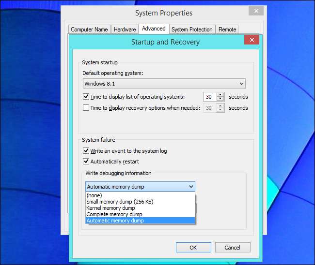Standardmäßig ist die Einstellung unter Debugging-Informationen schreiben auf "Automatischer Speicherauszug" eingestellt. Hier ist, was jeder Typ von Speicherauszug tatsächlich ist: