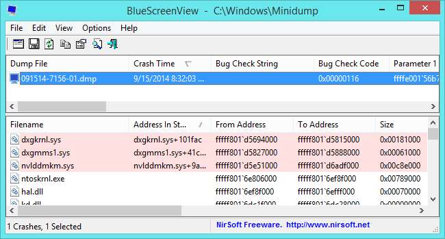 Werkzeuge wie BlueScreenView von Nirsoft kann die in diesen minidmp-Dateien enthaltenen Informationen anzeigen. Sie können die genauen Treiberdateien anzeigen, die an einem Absturz beteiligt sind, um die Ursache des Problems zu ermitteln. Da Minidumps so nützlich und klein sind, empfehlen wir, die Speicherauszugseinstellung niemals auf "(keine)" zu setzen. Konfigurieren Sie Ihr System mindestens so, dass kleine Speicherauszüge erstellt werden. Sie benötigen nicht viel Platz und helfen Ihnen, wenn Sie jemals auf ein Problem stoßen. Auch wenn Sie nicht wissen, wie Sie selbst Informationen aus der Minidump-Datei abrufen können, finden Sie hier Softwaretools und Personen, die diese Informationen verwenden können, um Ihr Systemproblem zu ermitteln und zu beheben.