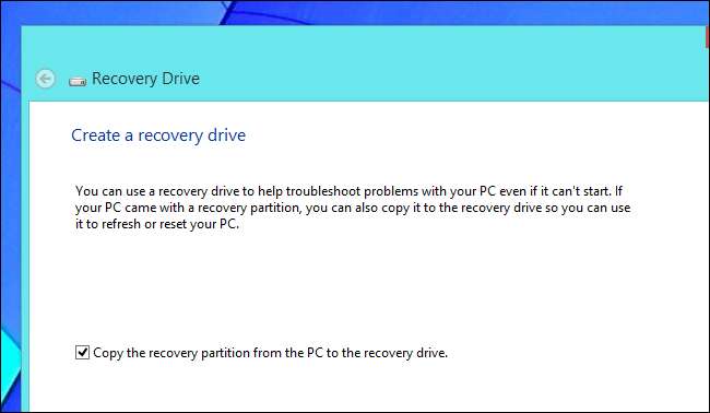 Για να το κάνετε αυτό, πατήστε το πλήκτρο Windows για πρόσβαση στην οθόνη Έναρξη και πληκτρολογήστε Recovery στην οθόνη Έναρξη για αναζήτηση. Κάντε κλικ στην επιλογή Δημιουργία μονάδας ανάκτησης. Όταν εμφανιστεί το παράθυρο της μονάδας ανάκτησης, βεβαιωθείτε ότι έχει επιλεγεί η επιλογή "Αντιγραφή του διαμερίσματος ανάκτησης από τον υπολογιστή στη μονάδα ανάκτησης" και μεταβείτε στον οδηγό. Λάβετε υπόψη ότι θα χρειαστείτε ένα USB stick αρκετά μεγάλο για να κρατάτε τα αρχεία της μονάδας ανάκτησης.