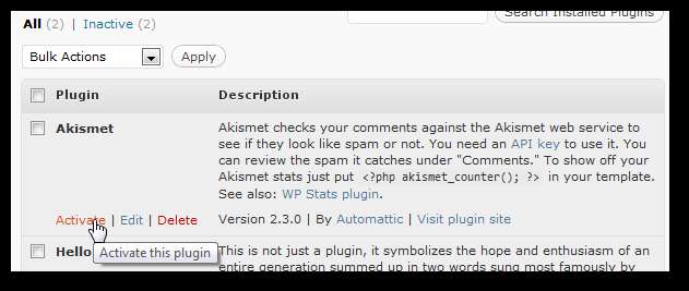 Θα παρατηρήσετε ότι δύο προεκτάσεις εγκαθίστανται από προεπιλογή: Akismet και Hello Dolly. Θέλουμε να ενεργοποιήσουμε το Akismet για προστασία από ανεπιθύμητα μηνύματα στο ιστολόγιό μας, αλλά πριν από την ενεργοποίηση, θα χρειαστείτε ένα κλειδί API. Εάν δεν έχετε ήδη ιστολόγιο WordPress.com ή λογαριασμό Akismet, μπορείτε να εγγραφείτε για δωρεάν λογαριασμό WordPress.com όπως αναφέρεται παραπάνω. Εναλλακτικά, εάν θέλετε να χρησιμοποιήσετε το Akismet μόνο και δεν θέλετε κάποιο από τα άλλα εργαλεία, κάντε κλικ στο Κλειδί API σύνδεσμος στην περιγραφή της προσθήκης.