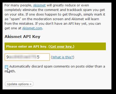 Εισαγάγετε το κλειδί API Akismet ή το κλειδί API WordPress.com στο πλαίσιο. Μπορείτε να επιλέξετε το Akismet να διαγράψει αυτόματα τα ανεπιθύμητα σχόλια μετά από ένα μήνα και, στη συνέχεια, να κάνετε κλικ Ενημέρωση επιλογών .