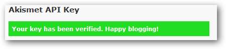 Η προσθήκη θα σας ενημερώσει ότι το κλειδί επαληθεύτηκε. Εάν δεν επαληθευτεί, βεβαιωθείτε ότι έχετε εισαγάγει σωστά το κλειδί και δοκιμάστε ξανά Τώρα το ιστολόγιό σας προστατεύεται με κορυφαία προστασία από ανεπιθύμητα μηνύματα, το ίδιο που χρησιμοποιείται στο WordPress.com, οπότε δεν θα χρειάζεται να ανησυχείτε για ανεπιθύμητα σχόλια που γεμίζουν τον ιστότοπό σας.
