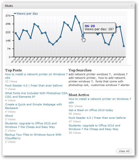 Τώρα όταν συνδέεστε στον πίνακα ελέγχου του WordPress, θα δείτε ένα νέο γραφικό στοιχείο Στατιστικά στοιχεία που εμφανίζει ένα γράφημα των στατιστικών σας και των δημοφιλών αναρτήσεων. Κάντε κλικ Προβολή όλων για να δείτε πιο λεπτομερή στατιστικά.