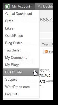 Πρώτον, ωστόσο, θα θέλετε να λάβετε ένα κλειδί API του WordPress.com Δύο από τις καλύτερες προσθήκες για WordPress, Akismet και WordPress.com Stats, και οι δύο απαιτούν ένα κλειδί API του WordPress. Εάν έχετε ήδη λογαριασμό WordPress.com, μπορείτε εύκολα να βρείτε αυτό το κλειδί για χρήση σε προσθήκες. Μεταβείτε στο WordPress.com και συνδεθείτε με τον τυπικό λογαριασμό σας. Στη γραμμή μενού στο επάνω μέρος, κάντε κλικ στο Ο λογαριασμός μου και μετά επιλέξτε Επεξεργασία προφίλ .