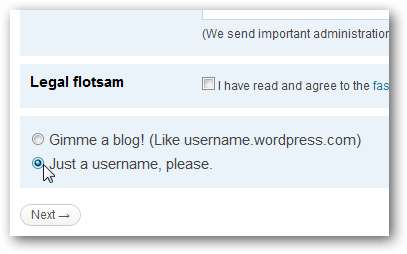 Εισαγάγετε τα στοιχεία σας και, στη συνέχεια, επιλέξτε το κάτω μέρος της φόρμας Απλώς ένα όνομα χρήστη . Αυτό θα σας δώσει έναν λογαριασμό WordPress χωρίς να δημιουργήσετε νέο ιστολόγιο. Μόλις ρυθμιστεί ο λογαριασμός σας, βρείτε το κλειδί API χρησιμοποιώντας τις παραπάνω οδηγίες.