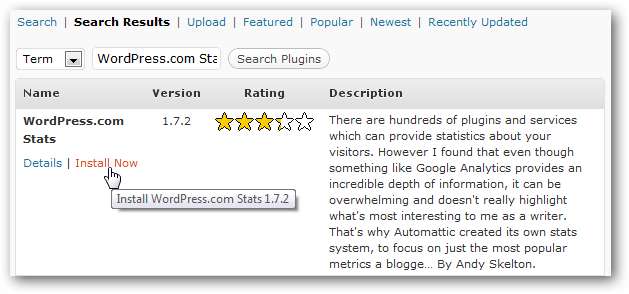 Αυτό θα αναδείξει τα στατιστικά στοιχεία του WordPress.com ως το πρώτο αποτέλεσμα. Κάντε κλικ Εγκατάσταση τώρα με το όνομά του.
