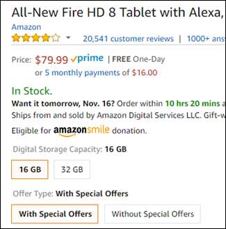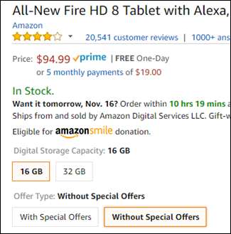 Έχετε μερικές επιλογές όταν αγοράζετε ένα κανονικό Fire Tablet. Συνήθως μπορείτε να επιλέξετε διαφορετικές χωρητικότητες αποθήκευσης και μπορείτε να επιλέξετε αν θέλετε τις «Ειδικές Προσφορές» της Amazon. Και τα δύο επηρεάζουν τη βασική τιμή του tablet, οπότε ας μιλήσουμε πρώτα για αυτά.