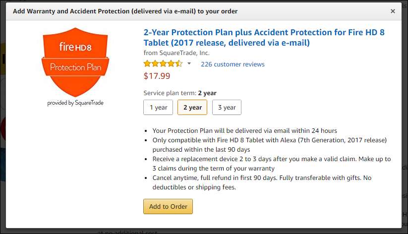 Εάν θέλετε να προσθέσετε μια εκτεταμένη εγγύηση στο τυπικό Fire HD 8, εξετάζετε ένα επιπλέον κόστος 18 $ για δύο χρόνια. Πρόκειται για ένα πρόσθετο aftermarket που παρέχεται από το SquareTrade, οπότε δεν είναι καν σαφές εάν έχει την ίδια πολιτική «χωρίς ερωτήσεις» της Kids Edition Ωστόσο, σας επιτρέπει να κάνετε έως και τρεις αξιώσεις κατά τη διάρκεια των δύο ετών, κάτι που είναι ωραίο.