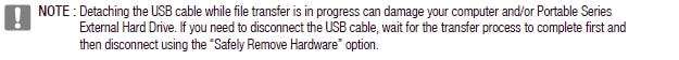 - Η αποσύνδεση του καλωδίου USB ενώ βρίσκεται σε εξέλιξη η μεταφορά αρχείων μπορεί να προκαλέσει ζημιά στον υπολογιστή σας ή / και στον εξωτερικό σκληρό δίσκο Portable Series.