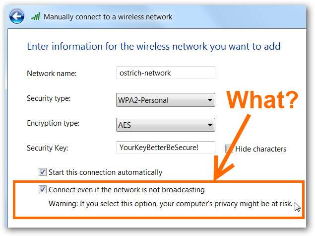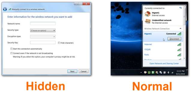 Τώρα που ξέρετε πόσο απλό είναι να βρίσκουν οι χρήστες την ταυτότητά σας, δεν θα προτιμούσατε να χρησιμοποιήσετε τις προεπιλεγμένες διαμορφώσεις δικτύου όπου μπορείτε εύκολα να επιλέξετε το δίκτυο από μια λίστα; Γιατί ακολουθήστε όλα τα βήματα που απαιτούνται για τη σύνδεση σε ένα κρυφό δίκτυο;
