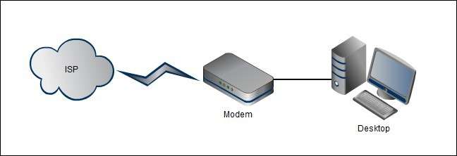 Ο επιτραπέζιος υπολογιστής σας συνδέεται απευθείας με το μόντεμ το οποίο με τη σειρά του συνδέεται απευθείας με τον ISP και το ευρύτερο Διαδίκτυο. Από την άποψη της συνδεσιμότητας, δεν υπάρχει τίποτα λάθος με αυτό το σχέδιο. Η σύνδεσή σας στο διαδίκτυο θα λειτουργήσει καλά, θα μπορείτε να περιηγηθείτε στον ιστό, να παίξετε παιχνίδια στο διαδίκτυο κ.λπ. Ωστόσο, από άποψη ασφάλειας, αυτή η ρύθμιση είναι τρομερή. Το καλωδιακό μόντεμ δεν είναι συσκευή ασφαλείας, αλλά συσκευή μεταφοράς δεδομένων.
