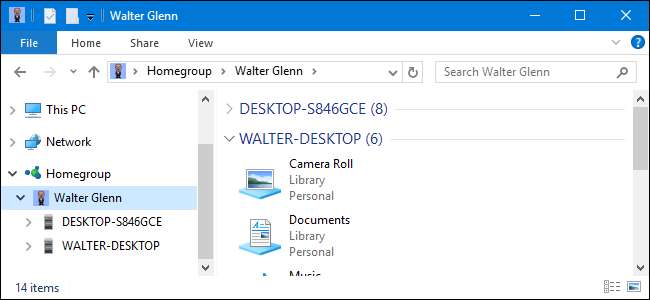 Όταν τελειώσετε, μπορείτε να ανοίξετε την Εξερεύνηση αρχείων, να κάνετε κλικ στο εικονίδιο της Οικιακής ομάδας στο παράθυρο περιήγησης και να περιηγηθείτε σε οτιδήποτε κοινοποιείται από άλλους υπολογιστές στην Οικιακή ομάδα. Εδώ, μπορείτε να δείτε ότι έχω δύο επιτραπέζιους υπολογιστές στο HomeGroup. Και οι δύο ομαδοποιούνται με το όνομά μου επειδή είμαι συνδεδεμένος και στους δύο με τον λογαριασμό χρήστη Microsoft
