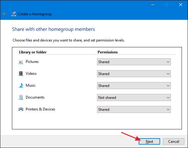 Στη συνέχεια, μπορείτε να δείτε όλους τους κύριους φακέλους - μαζί με Εκτυπωτές και συσκευές - που το HomeGroup σάς επιτρέπει να κάνετε κοινή χρήση από αυτόν τον υπολογιστή. Για κάθε στοιχείο, μπορείτε να χρησιμοποιήσετε το αναπτυσσόμενο μενού "Δικαιώματα" για να επιλέξετε εάν το στοιχείο είναι κοινόχρηστο ή όχι. Μοιραστείτε τα στοιχεία που θέλετε να μοιραστείτε και μετά κάντε κλικ στο "Επόμενο".
