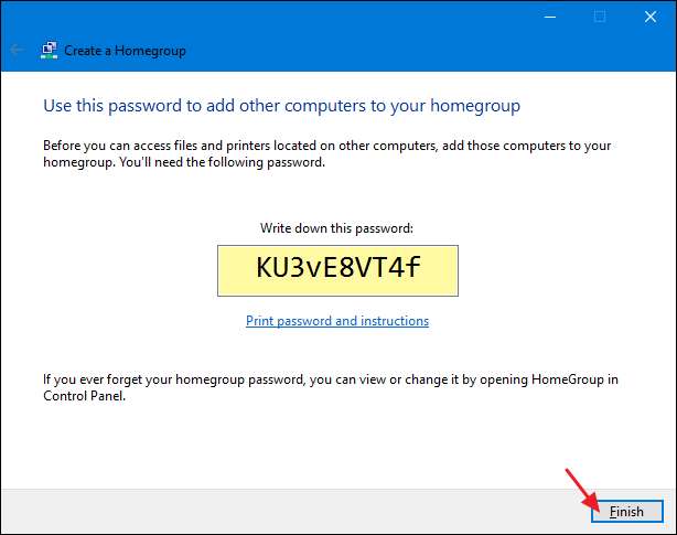 Στη συνέχεια, ο οδηγός θα σας δείξει έναν κωδικό πρόσβασης που θα χρειαστούν άλλοι υπολογιστές στο δίκτυο για να συμμετάσχουν στη νέα Οικιακή Ομάδα. Σημειώστε τον εάν θέλετε, αλλά μπορείτε πάντα να προβάλετε ή να αλλάξετε τον κωδικό πρόσβασης αργότερα εάν τον ξεχάσετε. Όταν τελειώσετε, κάντε κλικ στο «Τέλος».