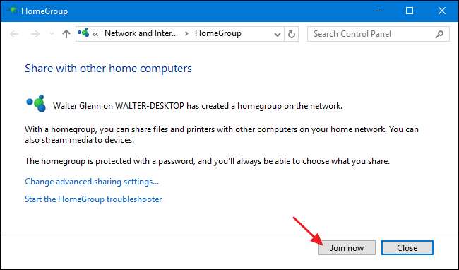 Εάν υπάρχει ήδη μια Οικιακή ομάδα στο δίκτυό σας, ή εάν μόλις δημιουργήσατε, η εγγραφή της από έναν νέο υπολογιστή ακολουθεί την ίδια διαδικασία με τη δημιουργία μιας νέας Οικιακής Ομάδας. Όταν ανοίγετε την εφαρμογή HomeGroup, τα Windows θα σας ενημερώσουν ότι βρήκε μια Οικιακή ομάδα στο δίκτυο. Κάντε κλικ στο κουμπί "Εγγραφή τώρα" για να εγγραφείτε στην Οικιακή ομάδα.