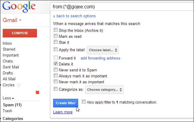 Όταν αντιμετωπίζετε ένα τέτοιο μήνυμα ηλεκτρονικού ταχυδρομείου στο Gmail, ανοίξτε το, κάντε κλικ στο σύνδεσμο Περισσότερα και επιλέξτε Φιλτράρισμα μηνυμάτων όπως αυτά. Συντονίστε το φίλτρο σας για να αποκλείσετε τα μηνύματα ηλεκτρονικού ταχυδρομείου - για παράδειγμα, εάν δεν ενδιαφέρεστε ποτέ να λαμβάνετε άλλα μηνύματα ηλεκτρονικού ταχυδρομείου από αυτόν τον αποστολέα, μπορείτε να φιλτράρετε με βάση τη διεύθυνση ηλεκτρονικού ταχυδρομείου του. Χρησιμοποιήστε το φίλτρο σας για να στείλετε όλα αυτά τα μηνύματα στον κάδο απορριμμάτων.