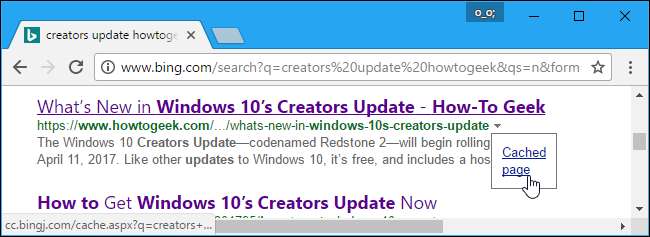 Ενώ εστιάσαμε στο Google Cache εδώ επειδή οι περισσότεροι χρησιμοποιούν το Google, η μηχανή αναζήτησης Bing της Microsoft έχει τη δική της παρόμοια δυνατότητα. Εάν χρησιμοποιείτε το Bing, μπορείτε να κάνετε κλικ στο κάτω βέλος στα δεξιά μιας διεύθυνσης και να κάνετε κλικ στο "Σελίδα προσωρινής αποθήκευσης" για να δείτε ένα αντίγραφο από την προσωρινή μνήμη του Bing.