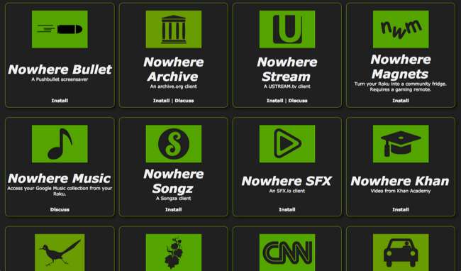 Ο άνθρωπος πουθενά έχει δημιουργήσει μια ποικιλία ιδιωτικών καναλιών που μπορείτε να εγκαταστήσετε, συμπεριλαμβανομένων πελατών για Twitter, Vine, CNN, USTREAM.tv, Songza και την ακαδημία Khan. Υπάρχει ακόμη και το "Nowhere Bullet", μια προφύλαξη οθόνης PushBullet που μπορεί εμφανίστε τις ειδοποιήσεις του τηλεφώνου ή του tablet Android στην τηλεόρασή σας.