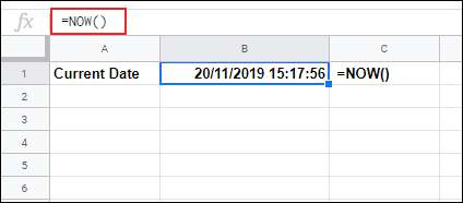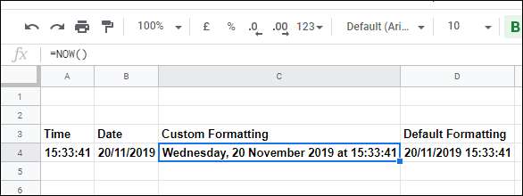 Μόλις εισαχθεί, το υπολογιστικό φύλλο των Φύλλων Google θα πρέπει από προεπιλογή να χρησιμοποιεί την τυπική μορφοποίηση για ΤΩΡΑ τύπους που εμφανίζει μια χρονική σήμανση με την τρέχουσα ώρα και ημερομηνία.